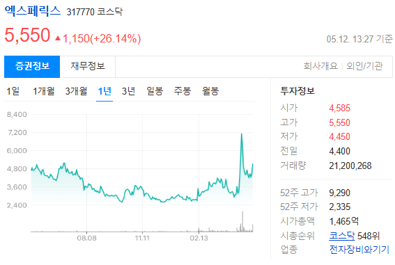 엑스페릭스의 주가는 2024년 하반기부터 2025년 초까지 강한 상승 랠리를 보였습니다. 특히 2차전지 및 반도체 장비 국산화 이슈가 부각되며 거래량이 폭증했고, 4월에는 일시적으로 신고가에 근접하는 모습도 있었습니다.