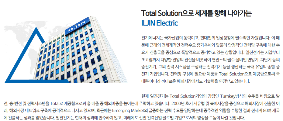 일진전기(일진전기 주식회사)는 1973년에 설립된 전력 기기 제조업체로, 주로 변압기, 회로 차단기, 전기 장비와 관련된 제품을 생산하는 기업입니다. 최근에는 친환경적인 전력 솔루션과 관련된 기술 및 제품을 통해 성장 가능성을 보여주고 있습니다. 일진전기는 국내뿐만 아니라 해외 시장에서도 활발히 활동 중입니다.